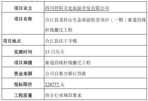 請通過資格審查的參加競爭性談判人員帶好有效身份證、公司介紹信、授權委托書、資質(zhì)證明等資料的原件與復印件(上述復印件須蓋單位鮮章,原件查驗后當場退還。于北京時間2019年9月18日9:00,在四川省瀘州市合江縣荔城大道190號四川符陽文化旅游開發(fā)有限公司二樓會議室公開舉行合江縣龍掛山生態(tài)旅游扶貧項目(一期)索道沿線桿線搬遷工程競爭性談判活動,四川符陽文化旅游開發(fā)有限公司根據(jù)承諾報價最低價原則確定中選人。