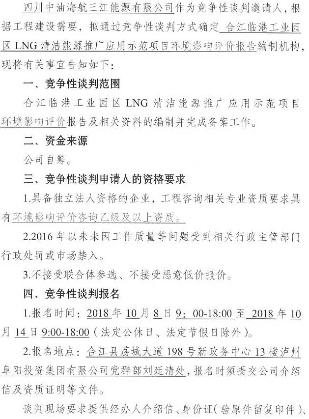 競(jìng)爭(zhēng)性談判公告:合江臨港工業(yè)園區(qū)LNG清潔能源推廣應(yīng)用示范項(xiàng)目環(huán)境影響評(píng)價(jià)單位競(jìng)爭(zhēng)性談判公告