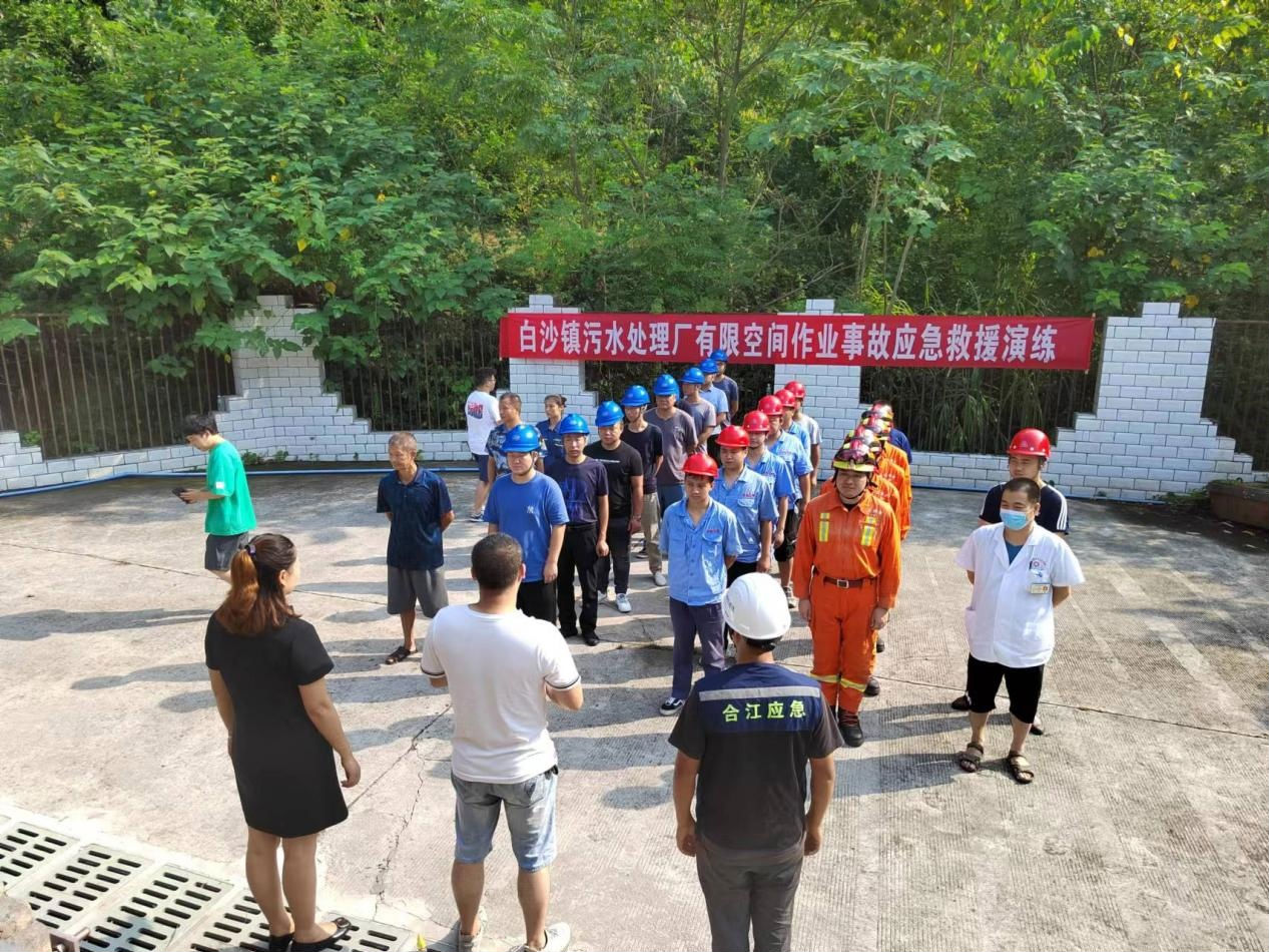2022 年 8 月 5 日, 白沙鎮(zhèn)人民政府、 江北消防中隊、 白沙衛(wèi)生院和瀘州匯鑫環(huán)??萍加邢薰韭?lián)合在白沙鎮(zhèn)城市生活污水處理廠開展有限空間作業(yè)應(yīng)急演練, 白沙鎮(zhèn)副鎮(zhèn)長周雪蓮、 安辦主任牟葉奎、 江北消防中隊指導(dǎo)員王小峰、 匯 鑫公司副經(jīng)理劉可參加了本次演練。